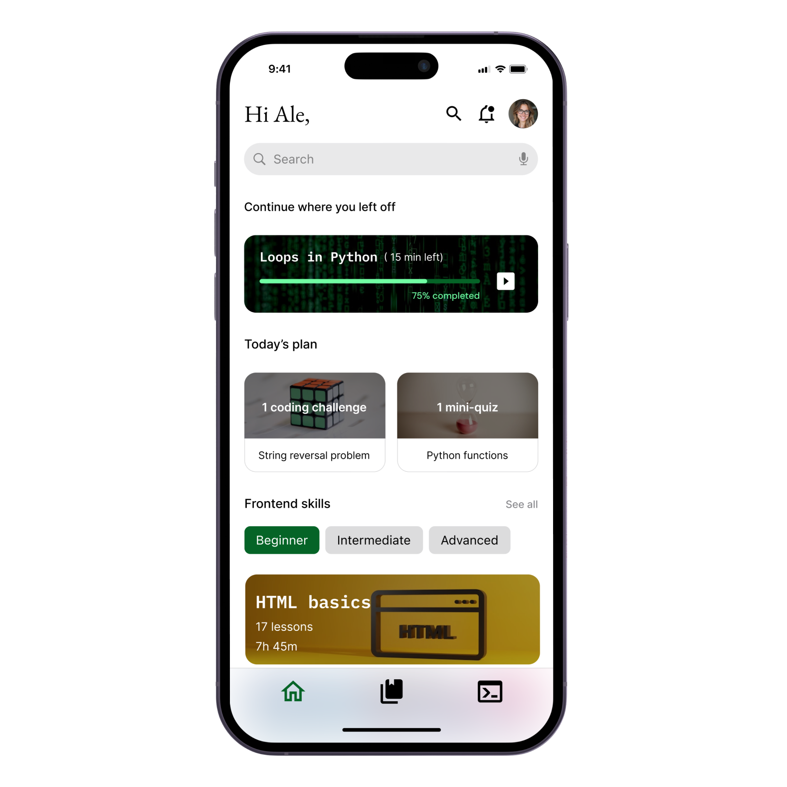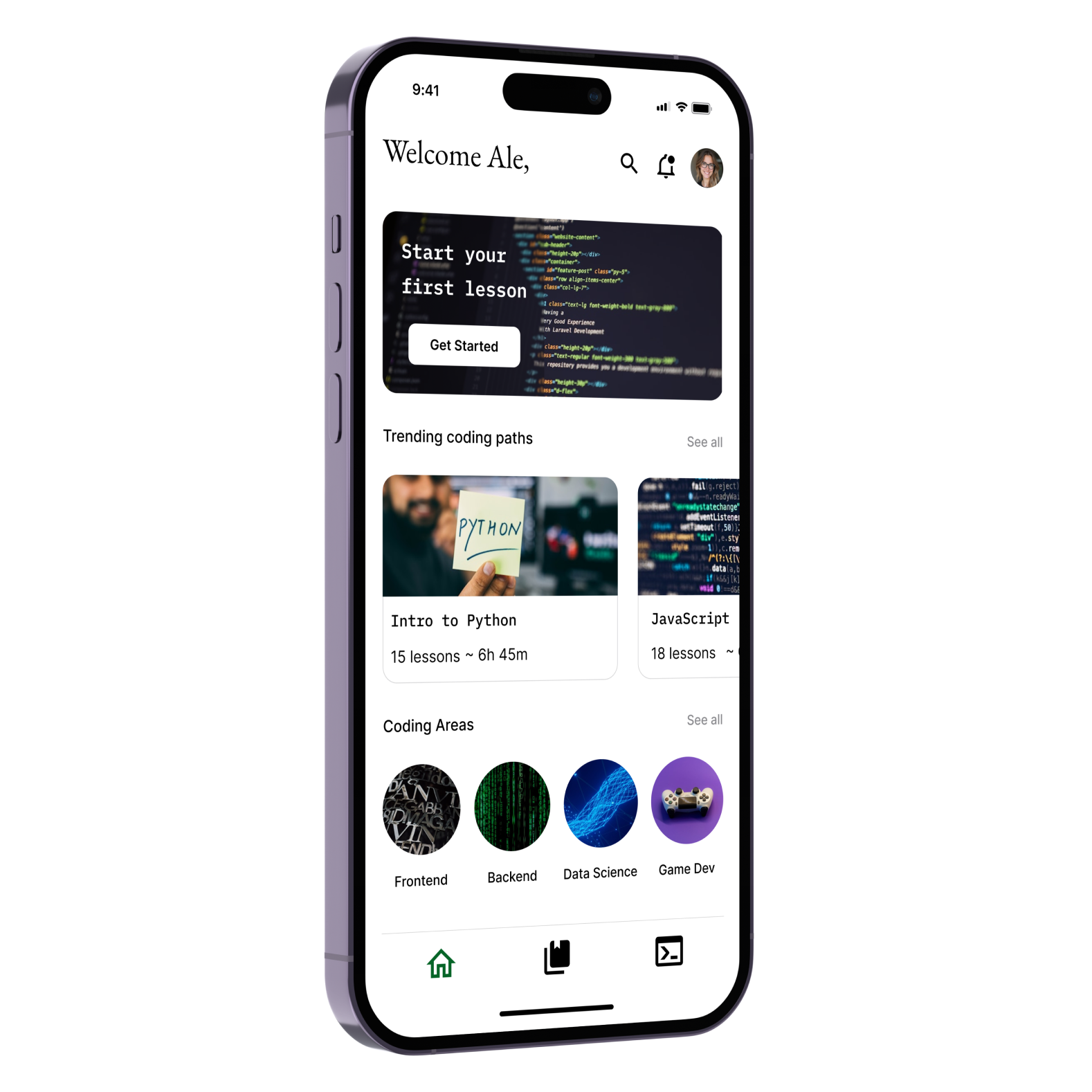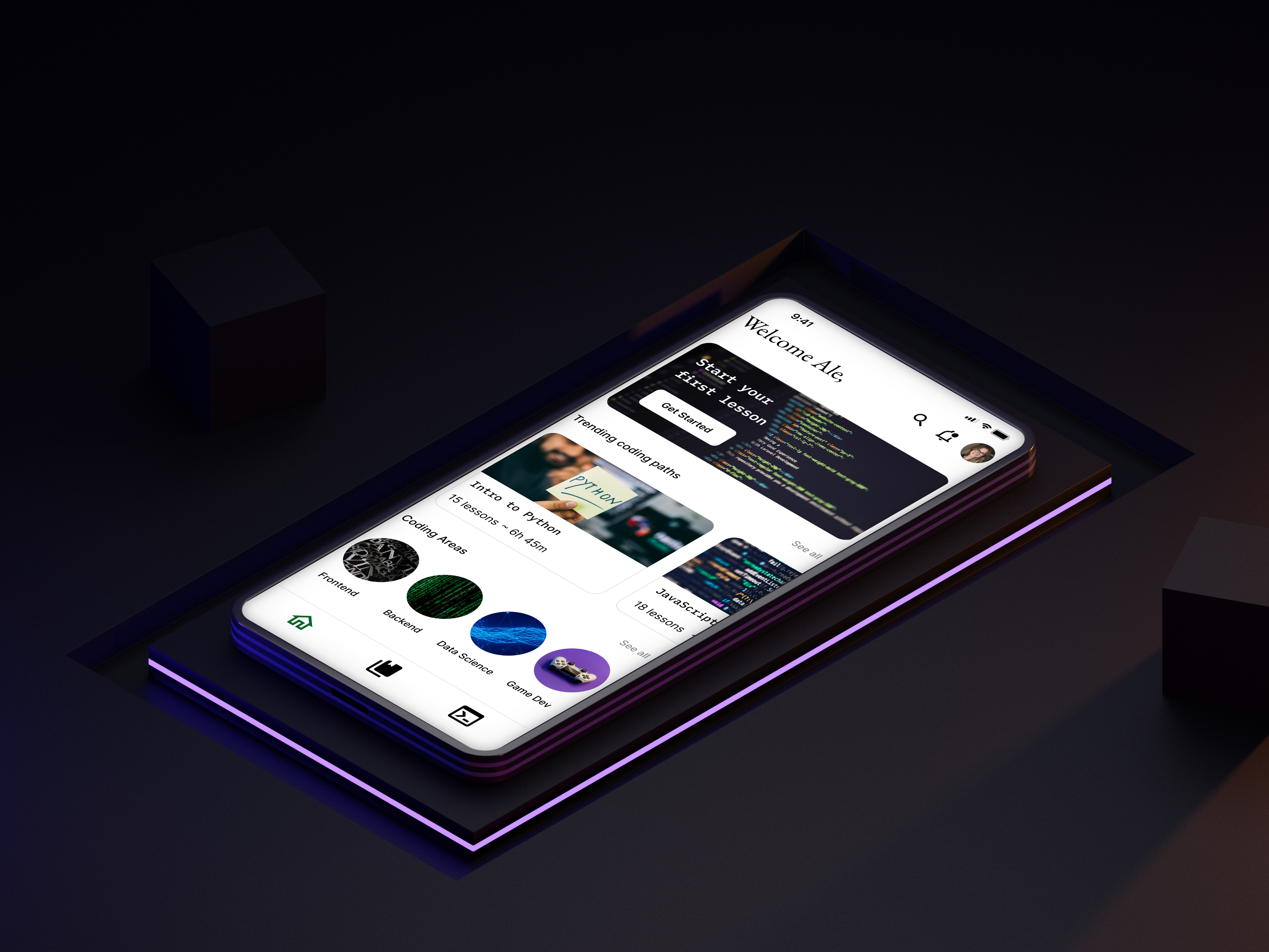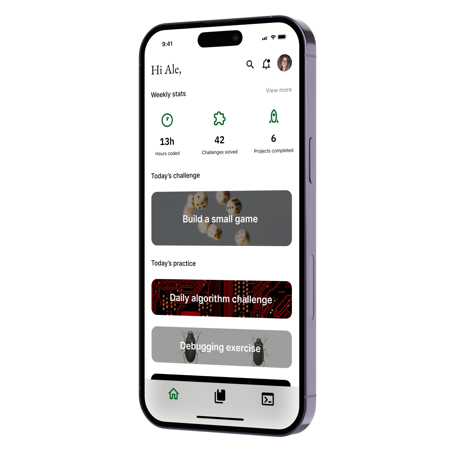The app is designed around each learner’s journey, starting with simple onboarding that reduces friction and builds confidence. Clear calls to action and intuitive navigation help new users explore without feeling overwhelmed, creating a smooth entry point into coding.