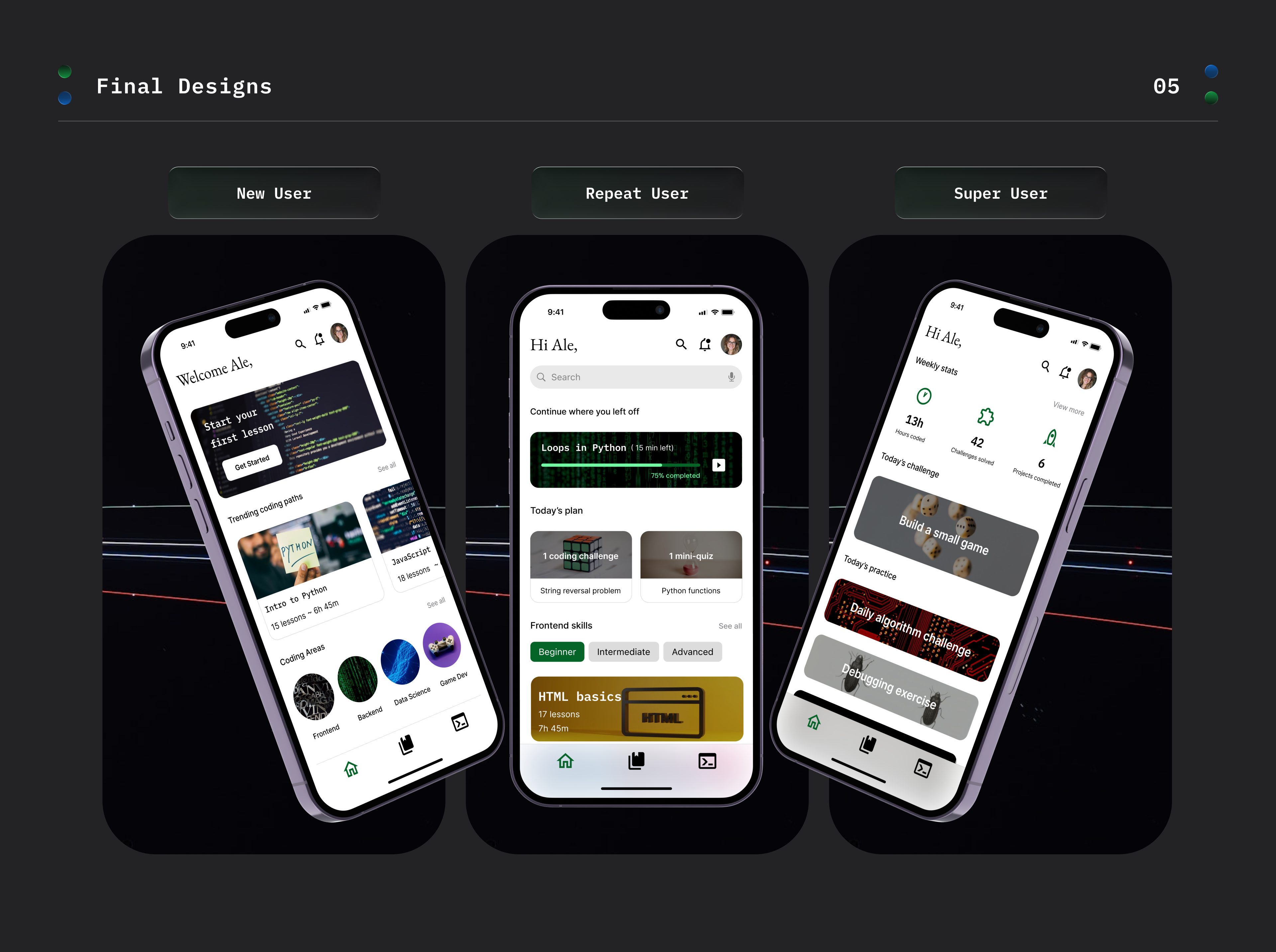 A design practice exploring a coding skill-building app that adapts to new, repeat, and advanced learners. It guides beginners with simple onboarding, motivates consistency for returning users, and empowers advanced users with stats, challenges, and personalized insights.