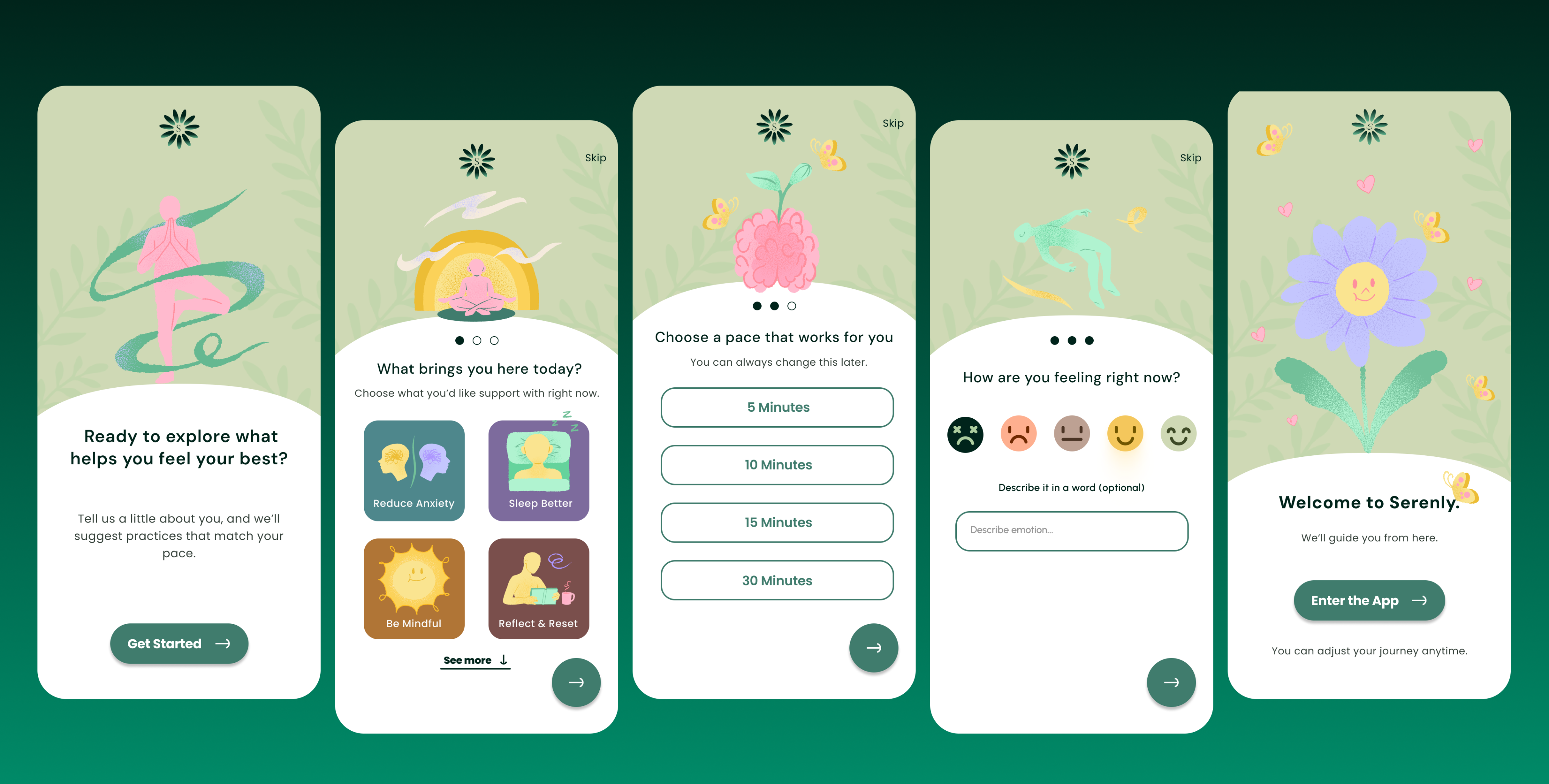 Serenly is a conceptual wellness app designed as part of the Daily UI Challenge #023, with a focus on crafting an emotionally supportive onboarding experience.
